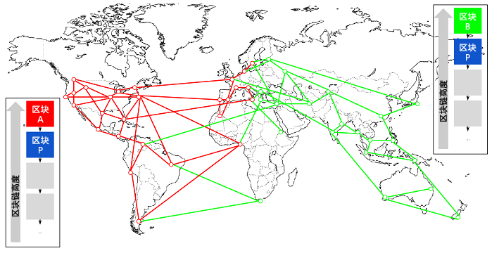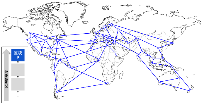 在下面的图例中,我们可以了解网络中发生分叉的过程。图例代表简单的全球比特币网络,在真实的情况下,比特币网络的拓扑结构不是基于地理位置组织起来的。相反,在同一个网络中相互连接的节点,可能在地理位置上相距遥远,我们采用基于地理的拓扑是为了更加简洁地描述分叉。在真实比特币网络里,节点间的距离按“跳”而不是按照真实位置来衡量。为了便于描述,不同的区块被标示为不同的颜色,传播这些区块的节点网络也被标上颜色。