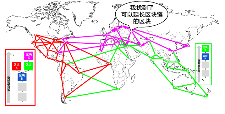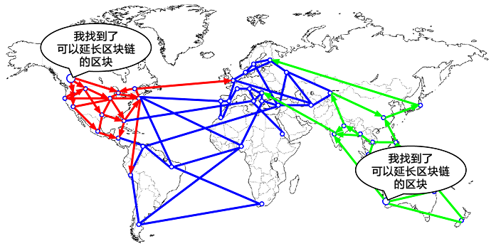 从那时起,比特币网络中邻近(网络拓扑上的邻近,而非地理上的)加拿大的节点会首先收到“红色”区块,并建立一个最大累计难度的区块,“红色”区块为这个链的最后一个区块(蓝色-红色),同时忽略晚一些到达的“绿色”区块。相比之下,离澳大利亚更近的节点会判定“绿色”区块胜出,并以它为最后一个区块来延长区块链(蓝色-绿色),忽略晚几秒到达的“红色”区块。那些首先收到“红色”区块的节点,会即刻以这个区块为父区块来产生新的候选区块,并尝试寻找这个候选区块的工作量证明解。同样地,接受“绿色”区块的节点会以这个区块为链的顶点开始生成新块,延长这个链。