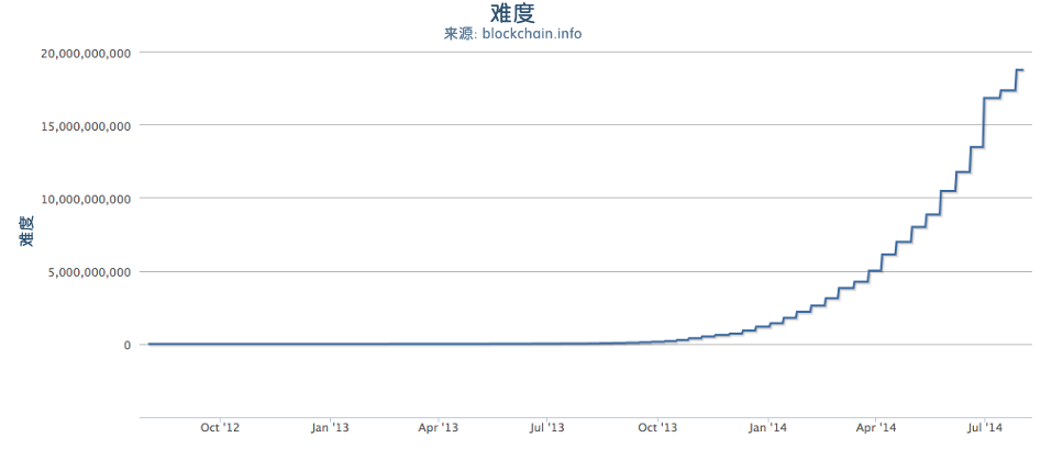 随着比特币挖矿算力的爆炸性增长,与之匹配的难度也相应增长。图3-2-8中的相对难度值显示了当前难度与最小难度(第一个块的难度)的比例。